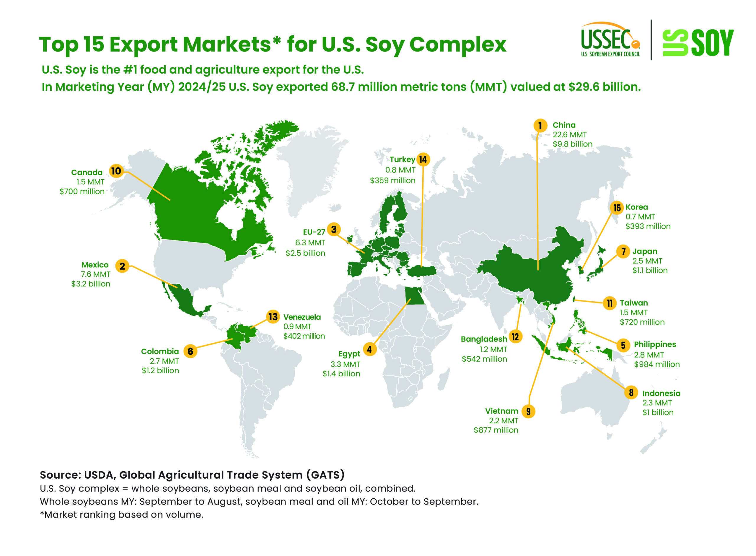 - Total U.S. Soy complex (whole soybeans, meal and oil), 68.7 million metric tons (MMT), valued at $29.6 billion.